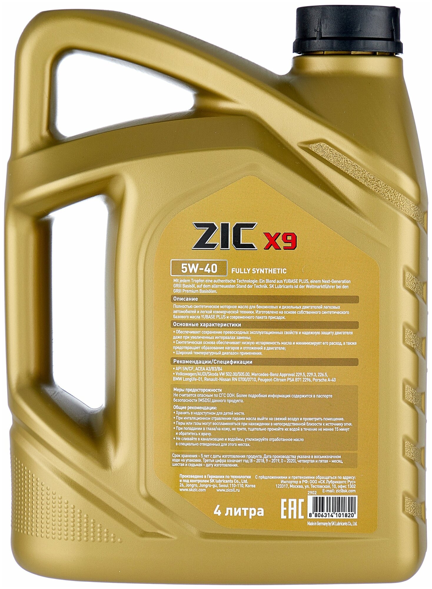 SAE viscosity grade: 5W-40, oil type: synthetic, fuel type: gasoline, diesel, API standard: CF, SN, SP, ACEA standard: A3/B4, A3/B3, A3, B3, B4, OEM approvals: BMW Longlife-01, MB 226.5, MB 229.3, MB 229.5, MB 229.51, PORSCHE A40, PSA B71 2296, Renault RN