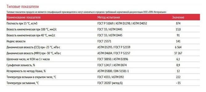 Density at 15 °C: 874 kg/m3; flash point in open crucible: 222°C; viscosity index: 141; pour point: -35 °C; kinematic viscosity at 40°C: 91, kinematic viscosity at 100°C: 13.8
