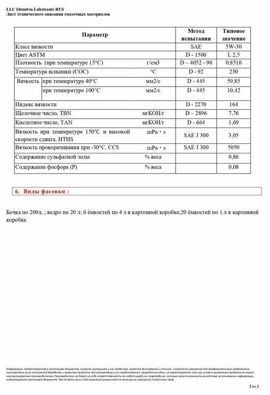 Density at 15 °C: 0.8510 g/cm3; flash point COC: 230 °C; viscosity at 40 °C: 59.85 mm2/s; viscosity at 100 °C: 10.42 mm2/s; viscosity index: 164; total base number, TBN: 7.76 mgKOH/g; foaming, at 93.0 °C: 10-0% by weight; viscosity at 150 °C and sk