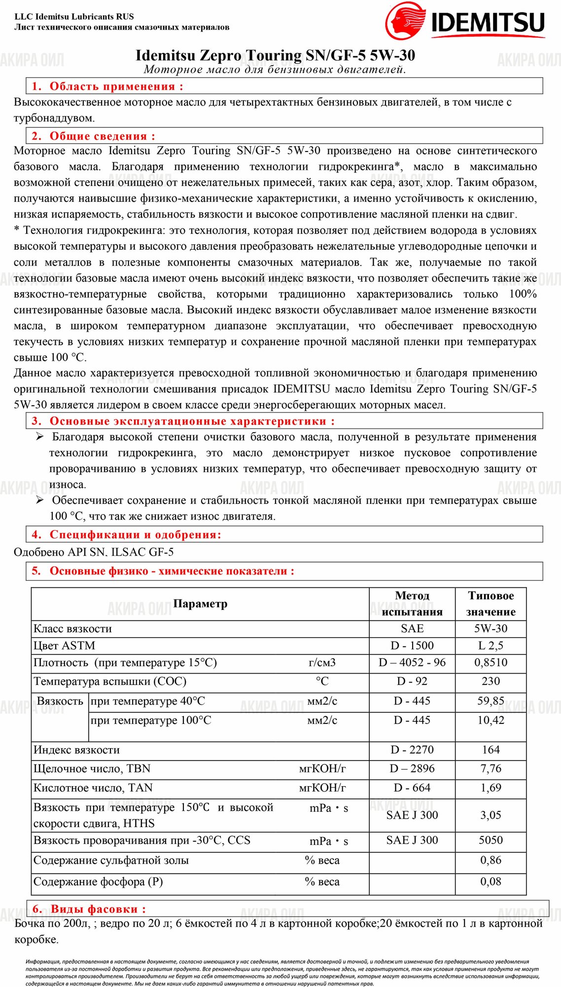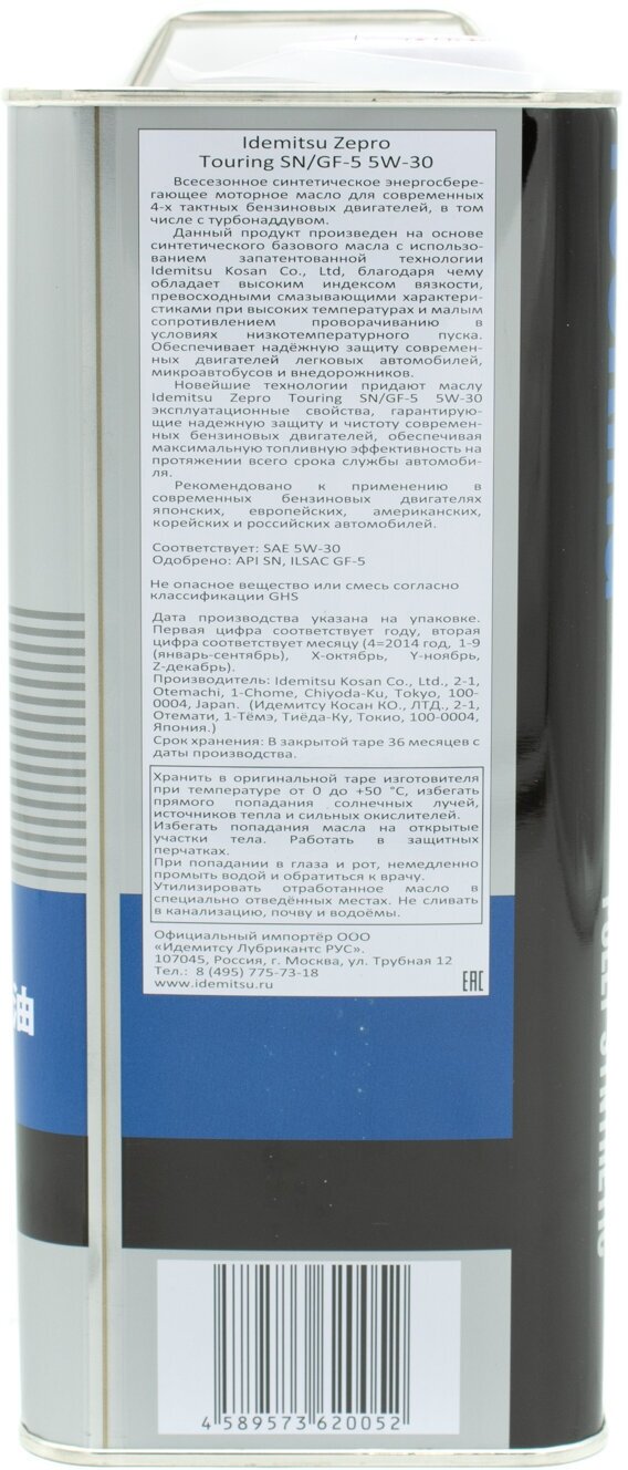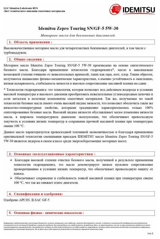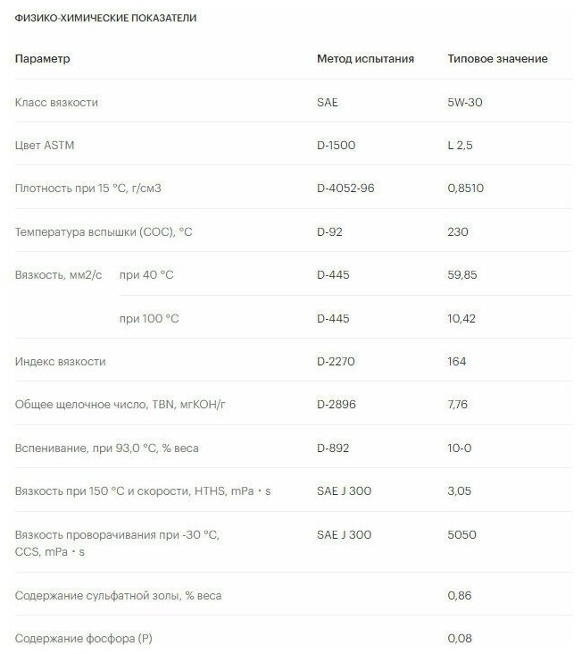SAE viscosity grade: 5W-30, oil type: synthetic, Synthetic all-season, vehicle type: passenger cars, fuel type: gasoline, diesel, methane, API standard: CF, GF-5, SN, ACEA standard: A3/B4, A3 , A5, OEM approvals: VW 502.00/505.00, ILSAC GF-5, ty