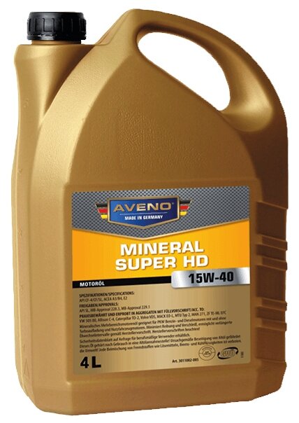 SAE viscosity grade: 15W-40, oil type: mineral, API standard: SL, ACEA standard: A3/B4, engine type: four-stroke, for turbocharged engines