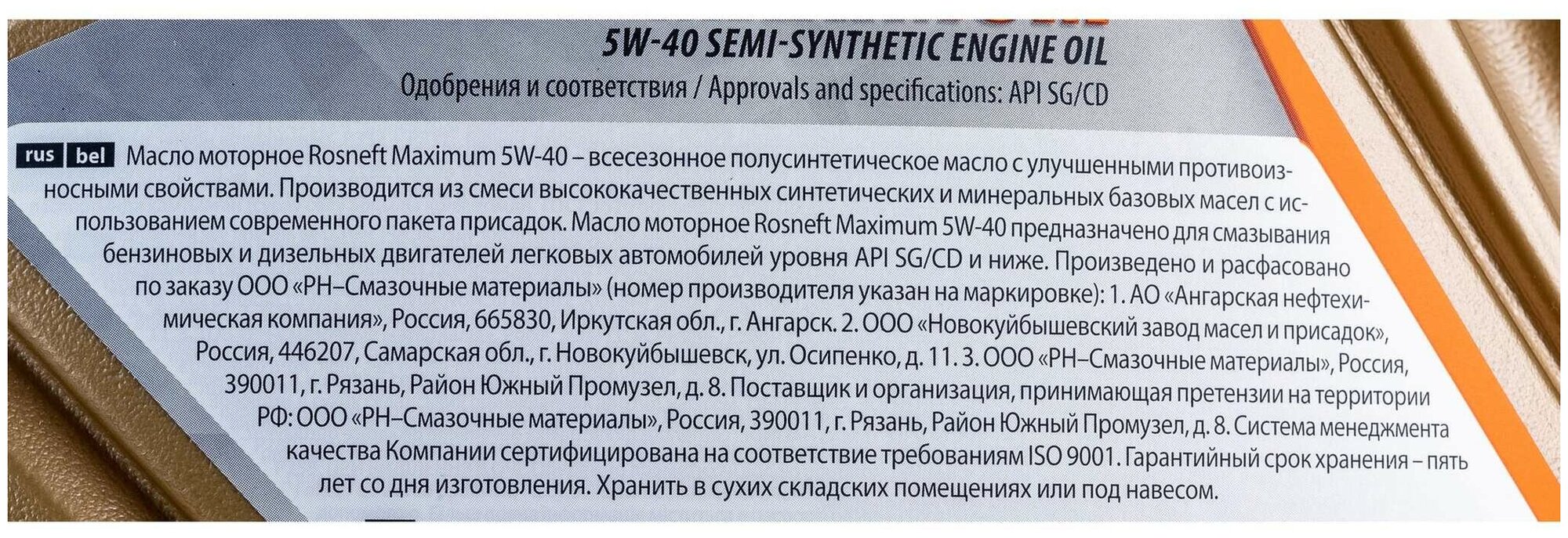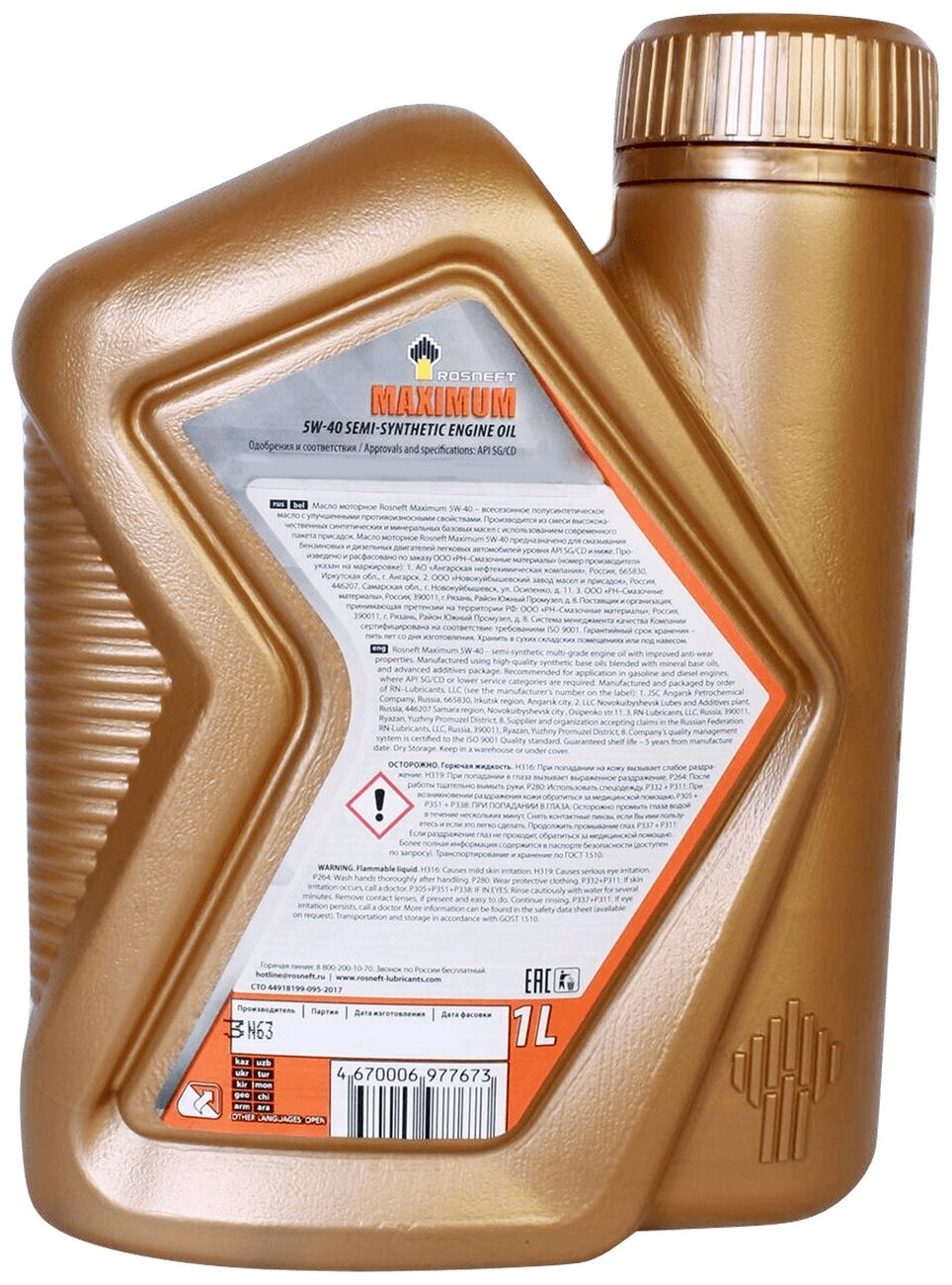 Additional Information: Rosneft Maximum 5W-40 engine oil is intended for use in gasoline and diesel engines, including turbocharged passenger cars and light trucks, where the use of oils is required
