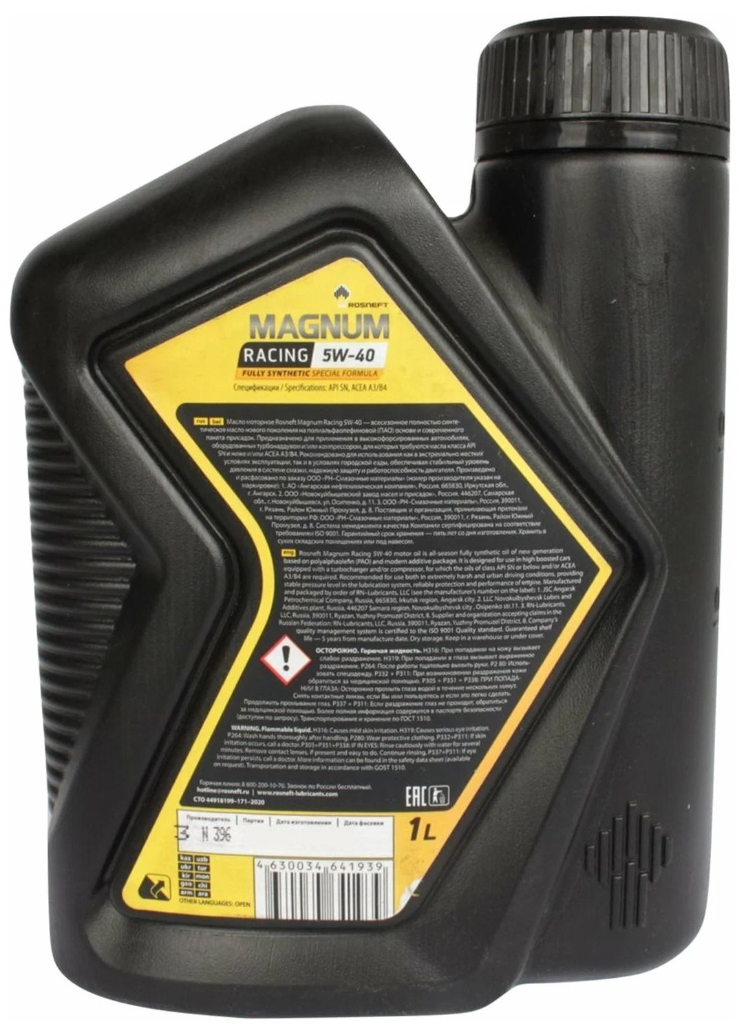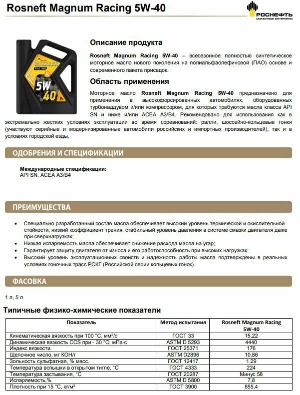 Additional Information: Rosneft Magnum Racing 5W-40 engine oil is intended for use in highly accelerated vehicles equipped with a turbocharger and/or compressor, which require oils of API SN class and lower and/or ACEA A3/B4. Recommended
