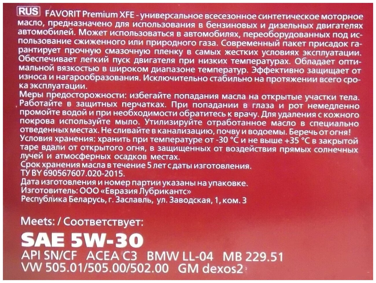 SAE viscosity grade: 5W-30, oil type: synthetic, fuel type: gasoline, diesel, API standard: CF, SN, ACEA standard: C3
