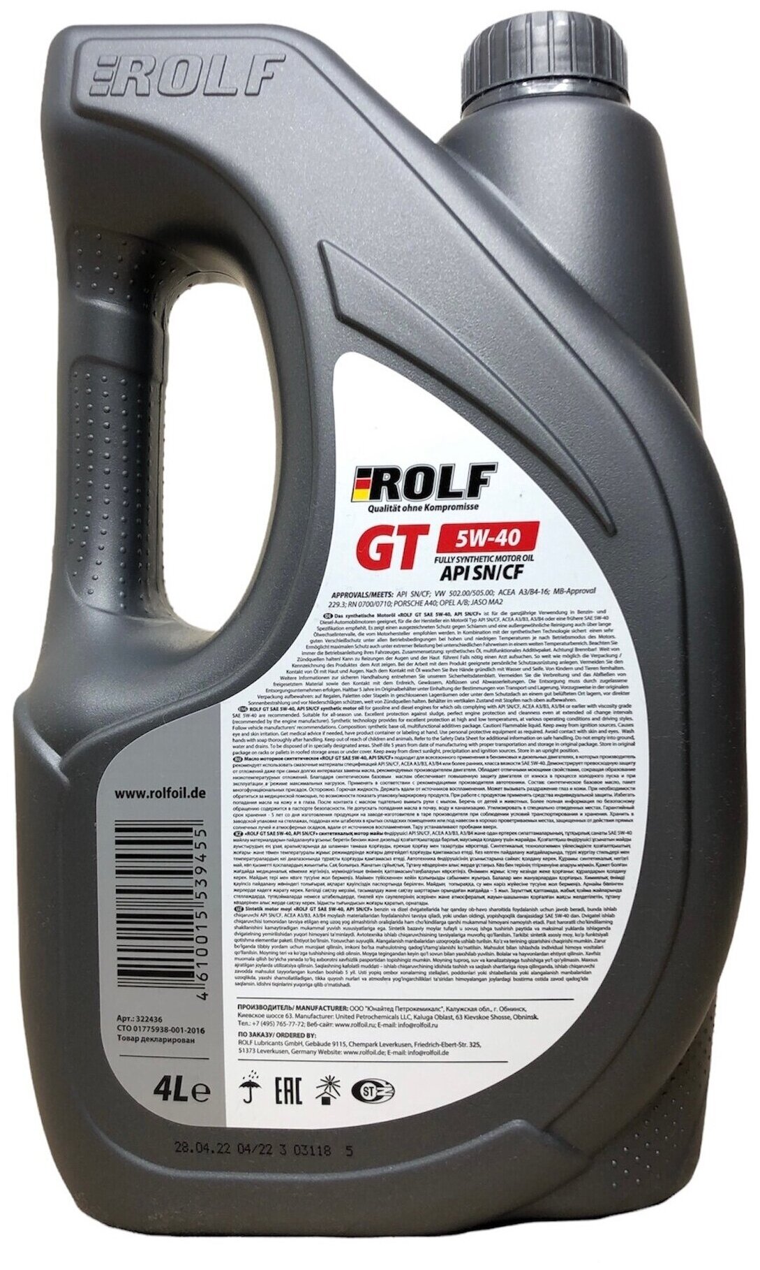 Additional Information: ROLF GT 5W-40 SN/CF is used in high performance gasoline and diesel engines in passenger cars, including those with turbocharging and exhaust gas aftertreatment systems. For all seasons