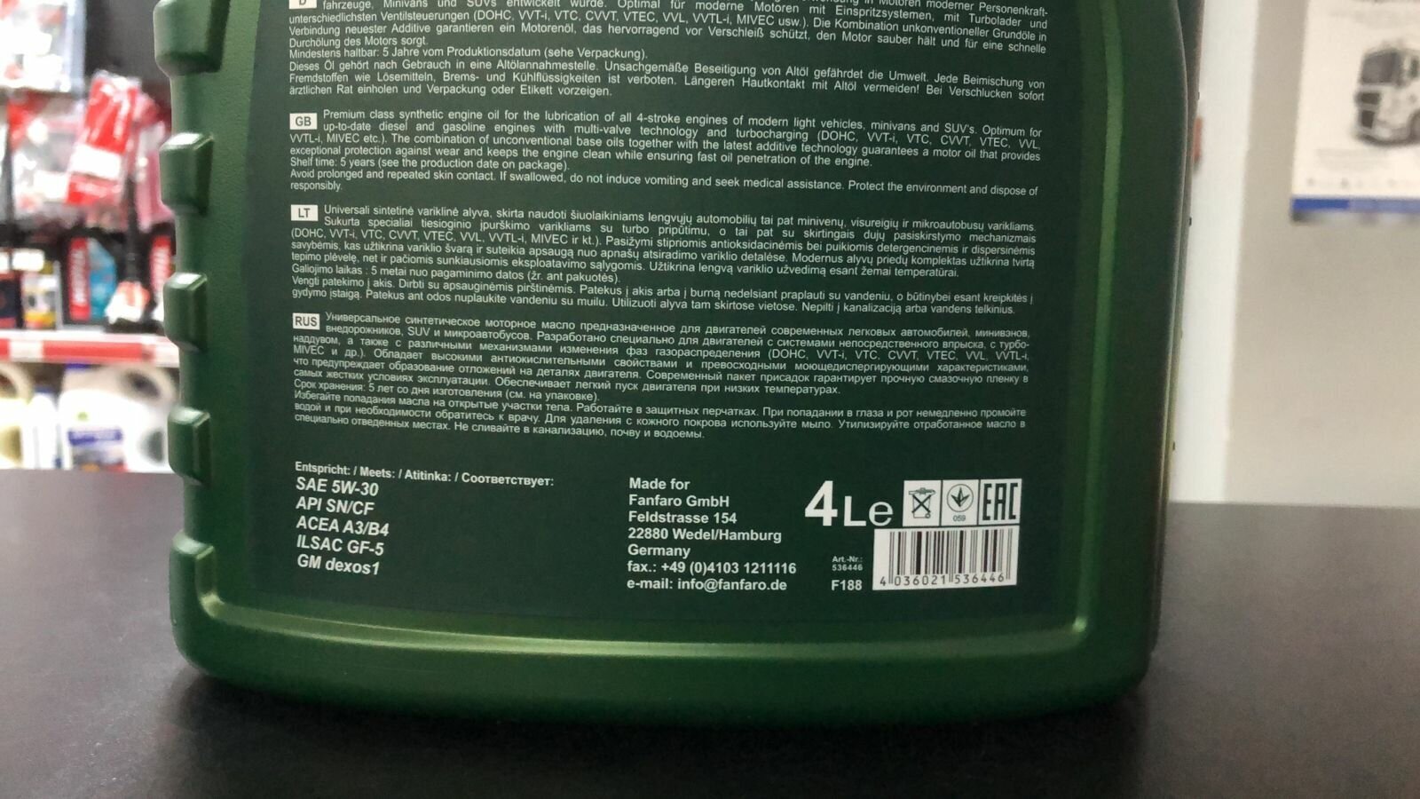 Description: SAE viscosity grade: 5W-30, oil type: synthetic, vehicle type: buses, trucks and special equipment, cars, snowmobiles, fuel type: gasoline, API standard: CF, SF, SM, SN, ACEA standard: A3/B4 , C3, OEM approvals: Chrysler