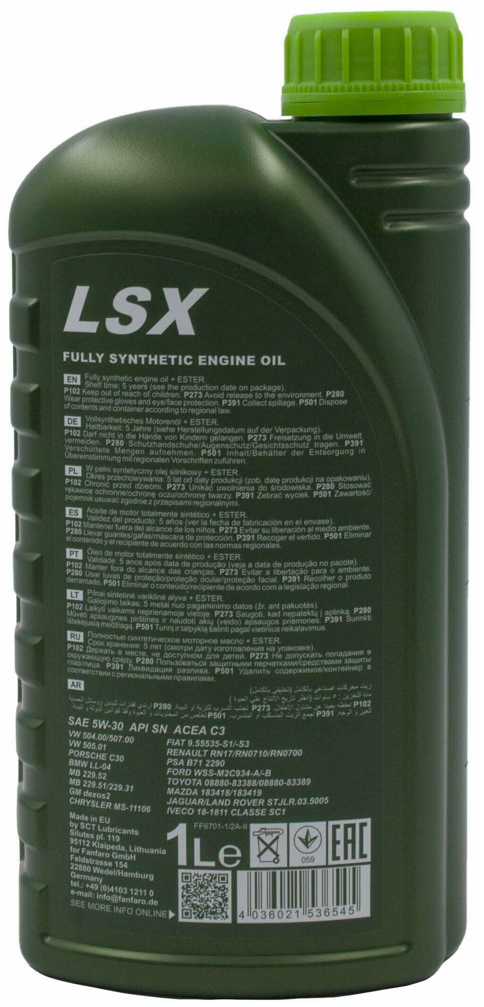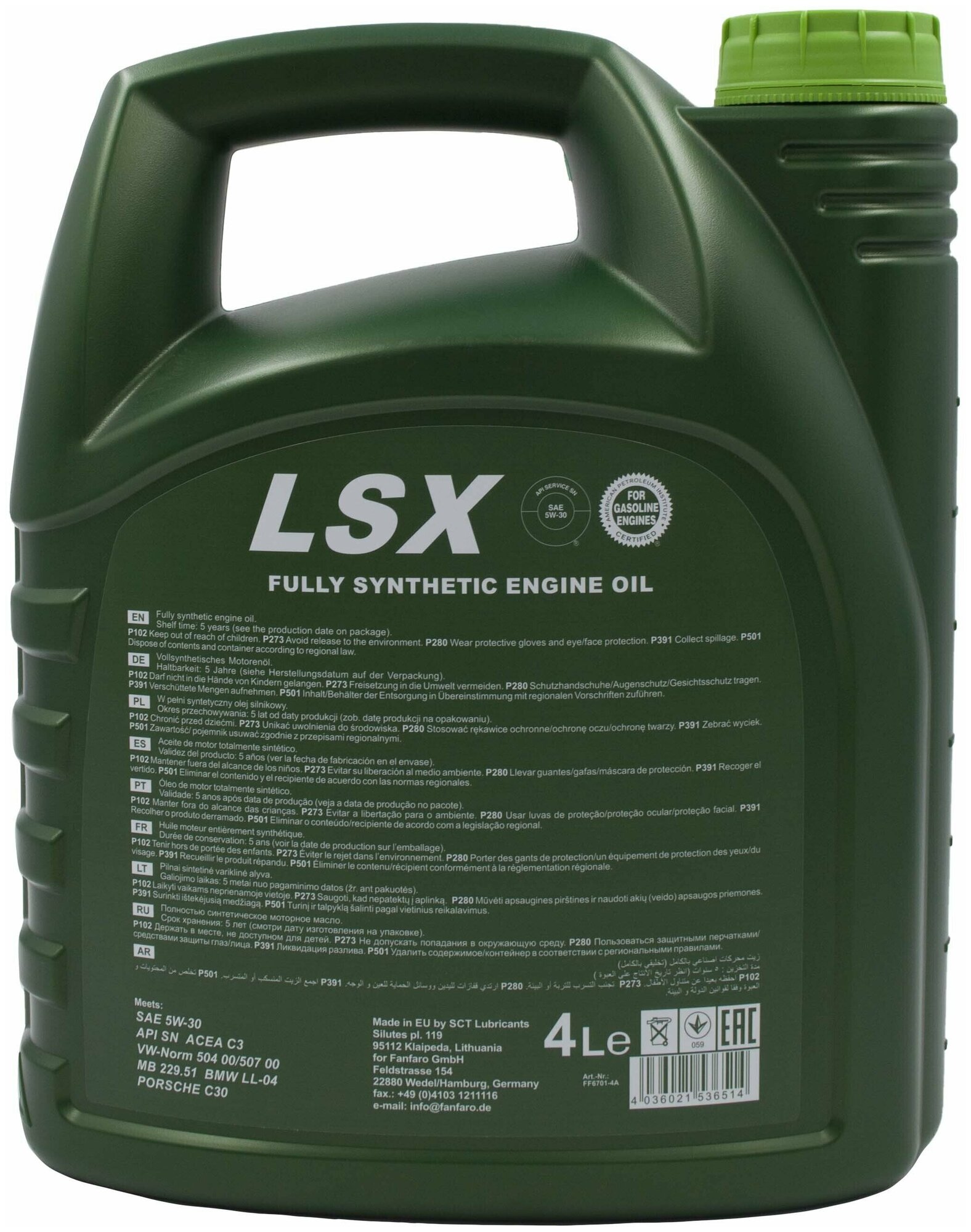 OEM Approvals: BMW Longlife-04, GM Dexos 2, MB 229.52, PORSCHE C30, FANFARO LSX 5W-30, MB 229.51BMW LL-04Porsche C30VW 504.00/507.00, VOLKSWAGEN 504 00 VOLKSWAGEN 507 00 PORSCHE C30 BMW LL-04 VOLKSWAGEN TL 52 195 MB 229.51