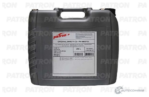 Synthetic 20l for cars ACEA C3, API SN CF, BMW LL 04, WSS M2C917 A, GM dexos2, MB 226 5 229 31 229 51, A40, RN0700 0710, VW 502 00 505 00 505 01 PATRON 5W40PIC320LORI GINAL