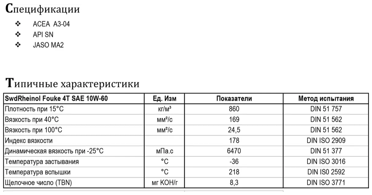SAE viscosity grade: 10W-60, oil type: semi-synthetic, synthetic, vehicle type: motorcycle, API standard: SN, engine type: four-stroke