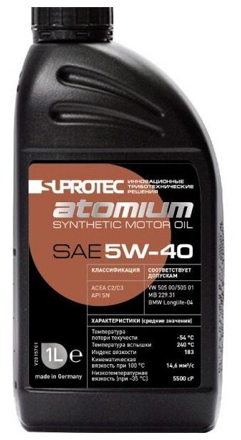 SAE viscosity grade: 5W-40, oil type: synthetic, vehicle type: passenger cars, fuel type: gasoline, diesel, API standard: SN, ACEA standard: C3, engine type: four-stroke, for turbocharged engines