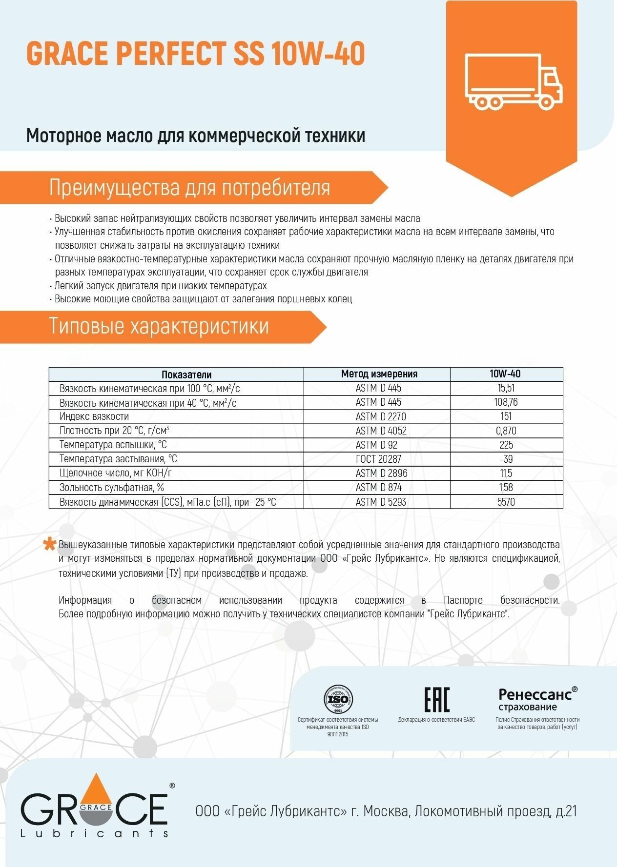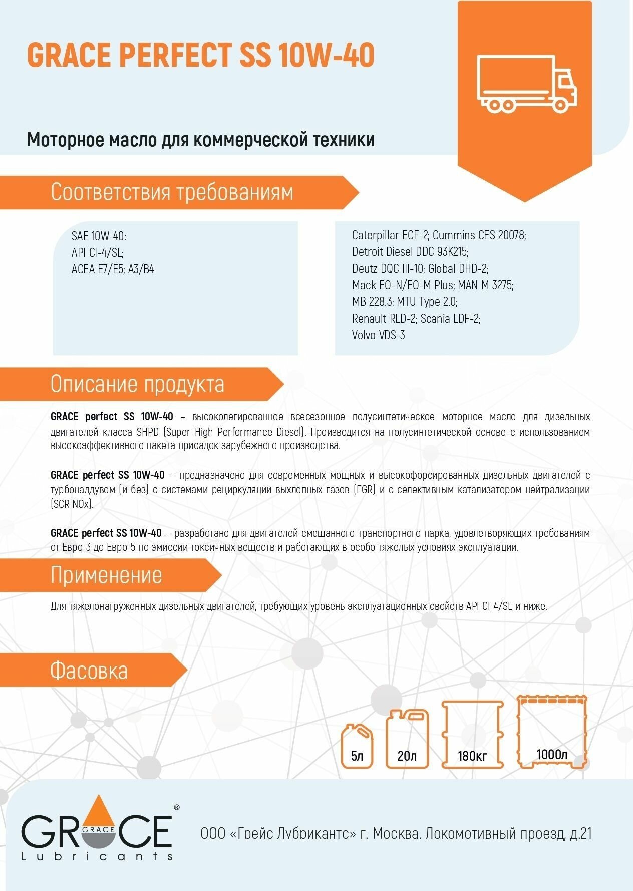 SAE viscosity grade: 10W-40, oil type: semi-synthetic, vehicle type: trucks and special equipment, fuel type: diesel, API standard: CI-4, SL, ACEA standard: E7, engine type: four-stroke