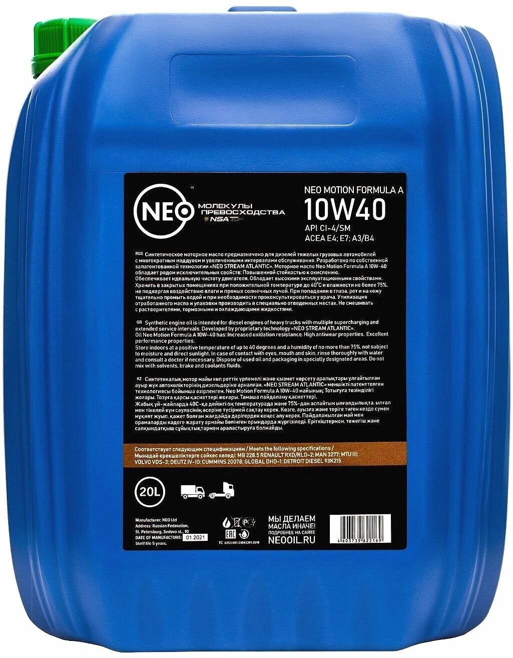 SAE viscosity grade: 10W-40, oil type: synthetic, vehicle type: trucks and special equipment, fuel type: gasoline, diesel, API standard: CI-4, SM, ACEA standard: E4, E7, OEM approvals: DEUTZ IV- IO; CUMMINS 20078 GLOBAL DHD-1; DETROIT DIESEL 93K215, MB 22