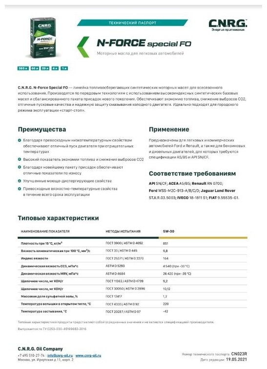 SAE viscosity grade: 5W-30, oil type: synthetic, vehicle type: passenger cars, fuel type: gasoline, diesel, API standard: CF, SN, ACEA standard: A5/B5, A3, B3, B4, OEM approvals: Renault RN 0700 Ford WSS-M2C-913-A/B/C/D Jaguar Land Rover STJLR.03.5003 IVE