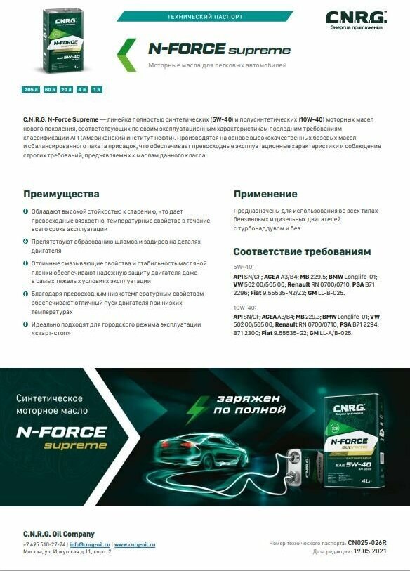 SAE viscosity grade: 5W-40, oil type: synthetic, fuel type: gasoline, diesel, API standard: CF, SN, ACEA standard: A3/B4, OEM approvals: BMW Longlife-01, FIAT 9.55535-Z2, GM-LL -A-025, MB 229.5, PSA B71 2296, Renault RN 0700, Renault RN 0710, VW 502.00/50