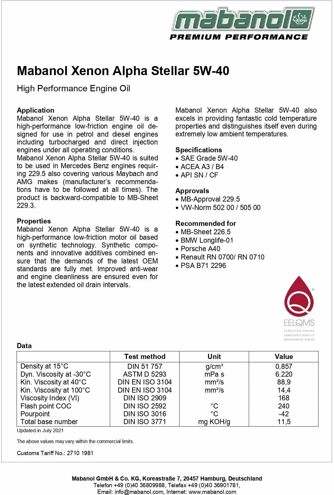 SAE viscosity grade: 5W-40, oil type: synthetic, vehicle type: passenger cars, fuel type: gasoline, diesel, API standard: CF, SN, ACEA standard: A3/B4, OEM approvals: BMW Longlife-01, MB 226.5 , MB 229.5, PORSCHE A40, PSA B71 2296, Opel/GM GM-LL-B-025, Re