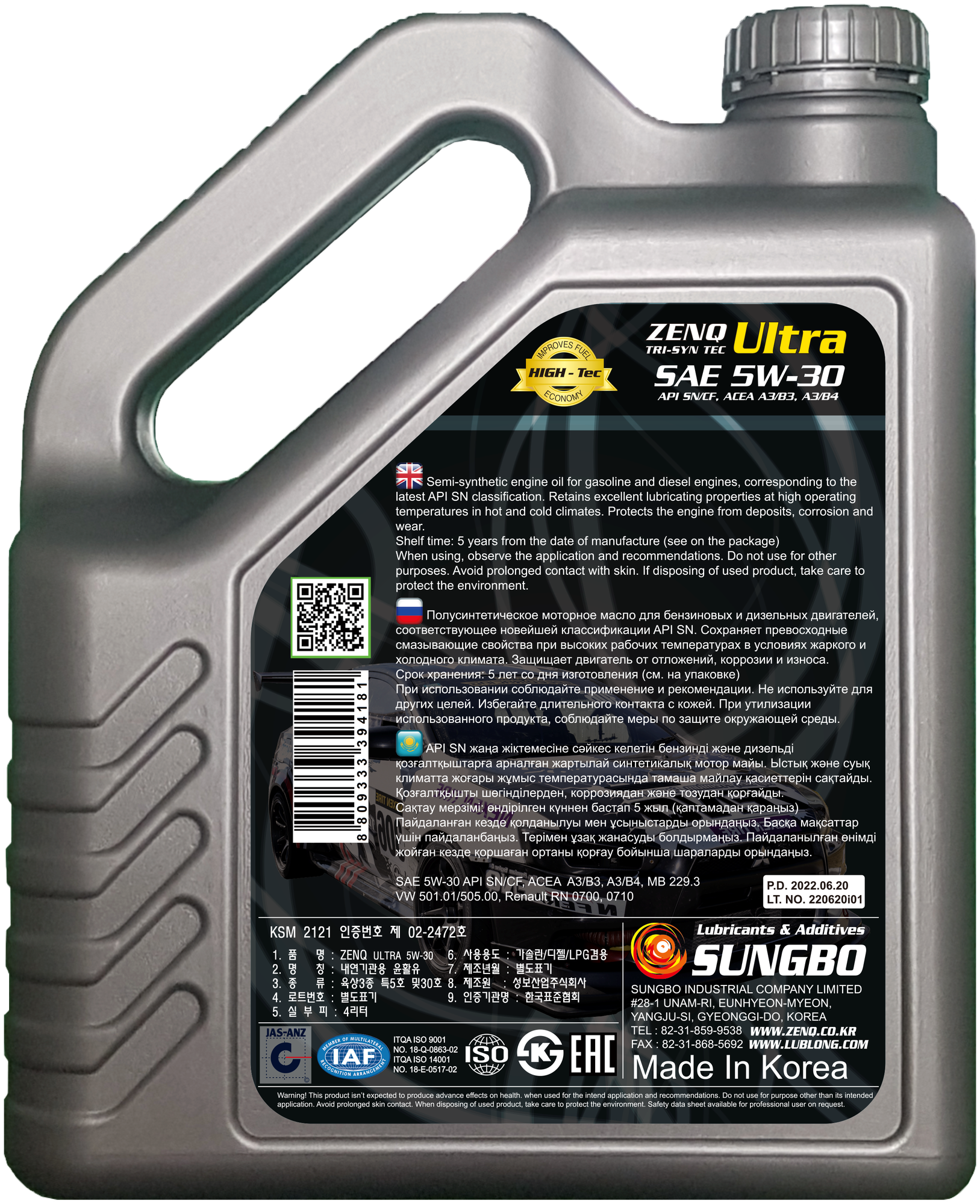 Motor. ZENQ Ultra 5W30 p/s SN/CF; ACEA A3/B3, A3/B4 4L