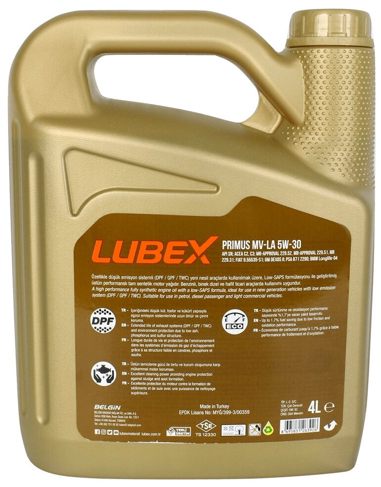 SAE viscosity grade: 5W-30, oil type: synthetic, vehicle type: passenger cars, fuel type: gasoline, diesel, API standard: SN, ACEA standard: C2, C3, OEM approvals: BMW Longlife-04, FIAT 9.55535-S1 , GM Dexos 2, MB 229.31, MB 229.51, MB 229.52, PSA B 71 22
