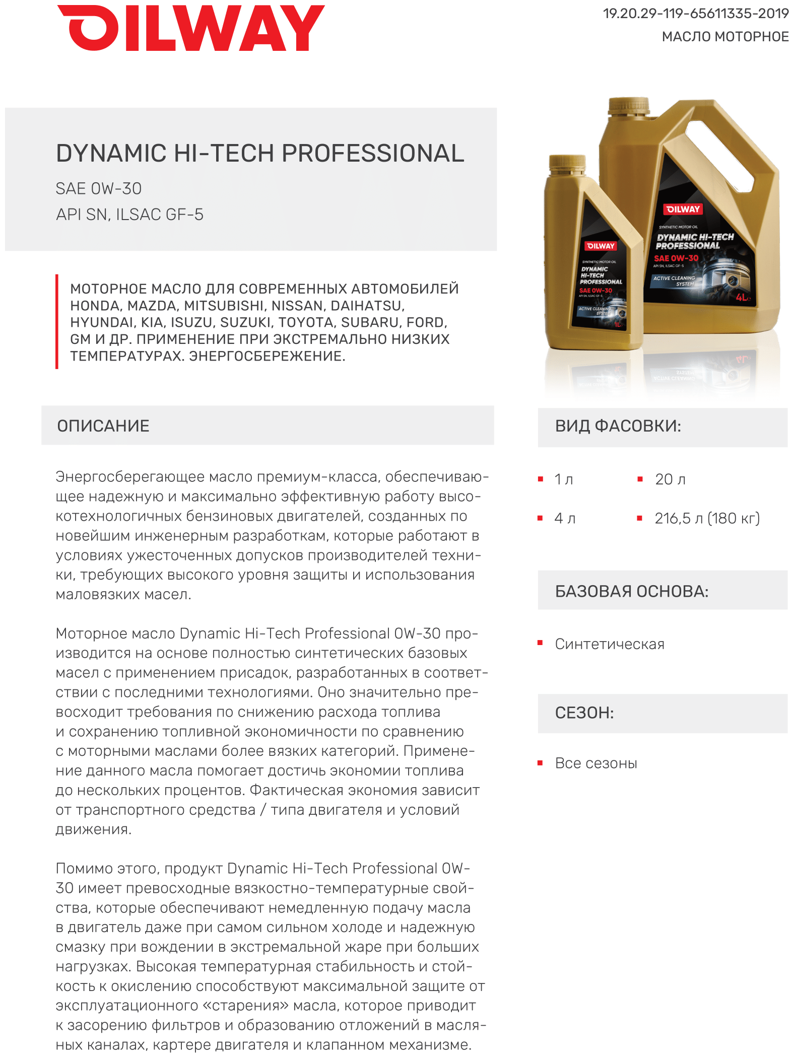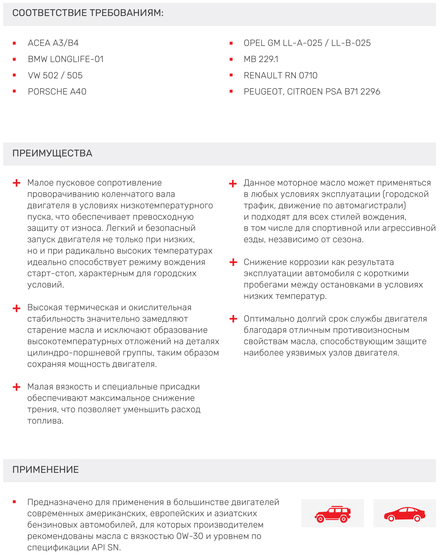 SAE viscosity grade: 0W-30, oil type: synthetic, fuel type: gasoline, API standard: SN, ACEA standard: A3/B4, OEM approvals: BMW Longlife-01, GM-LL-A-025, GM-LL- B-025, MB 229.1, PORSCHE A40, PSA B71 2296, Renault RN 0710, VW 502.00, VW 502.00/505.00, VW