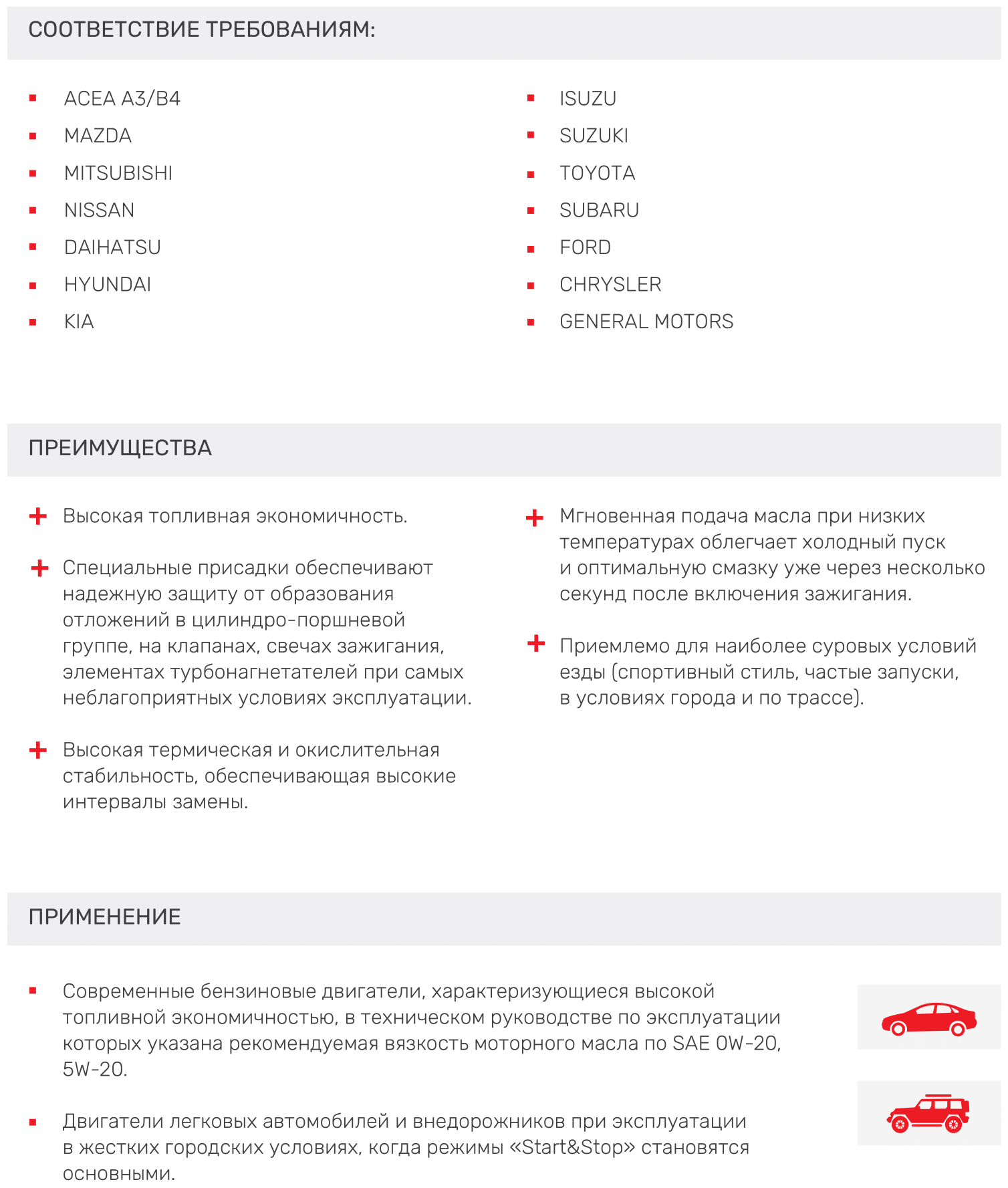 SAE viscosity grade: 0W-20, oil type: synthetic, fuel type: gasoline, API standard: SN, ACEA standard: A3/B4, OEM approvals: MAZDA MITSUBISHI NISSAN DAIHATSU HYUNDAI KIA ISUZU SUZUKI TOYOTA SUBARU FORD CHRYSLER GENERAL MOTORS