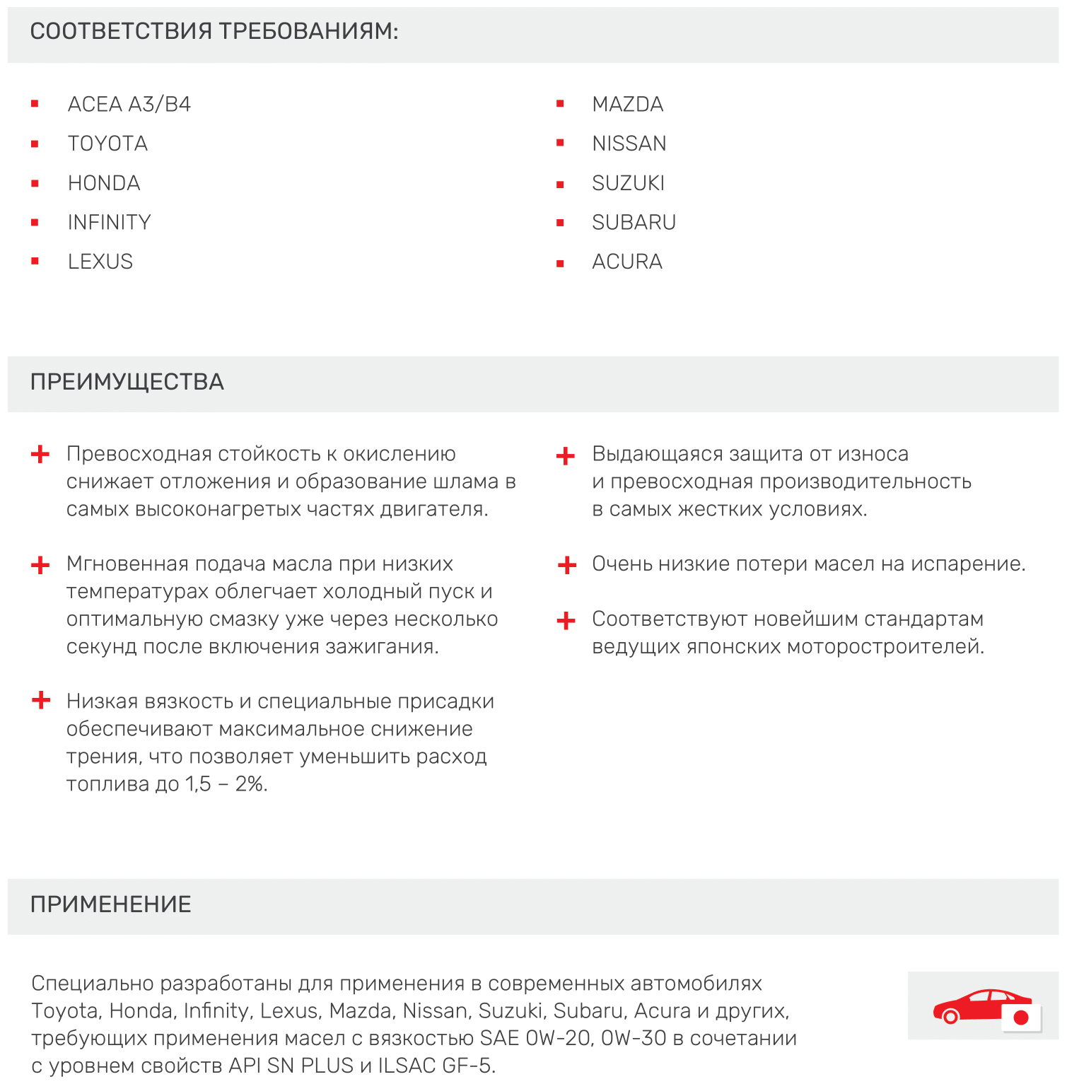 SAE viscosity grade: 0W-30, oil type: synthetic, fuel type: gasoline, API standard: SN+, ACEA standard: A3/B4, OEM approvals: TOYOTA ; HONDA; INFINITY ; LEXUS; MAZDA ; NISSAN; SUZUKI ; SUBARU ; ACURA