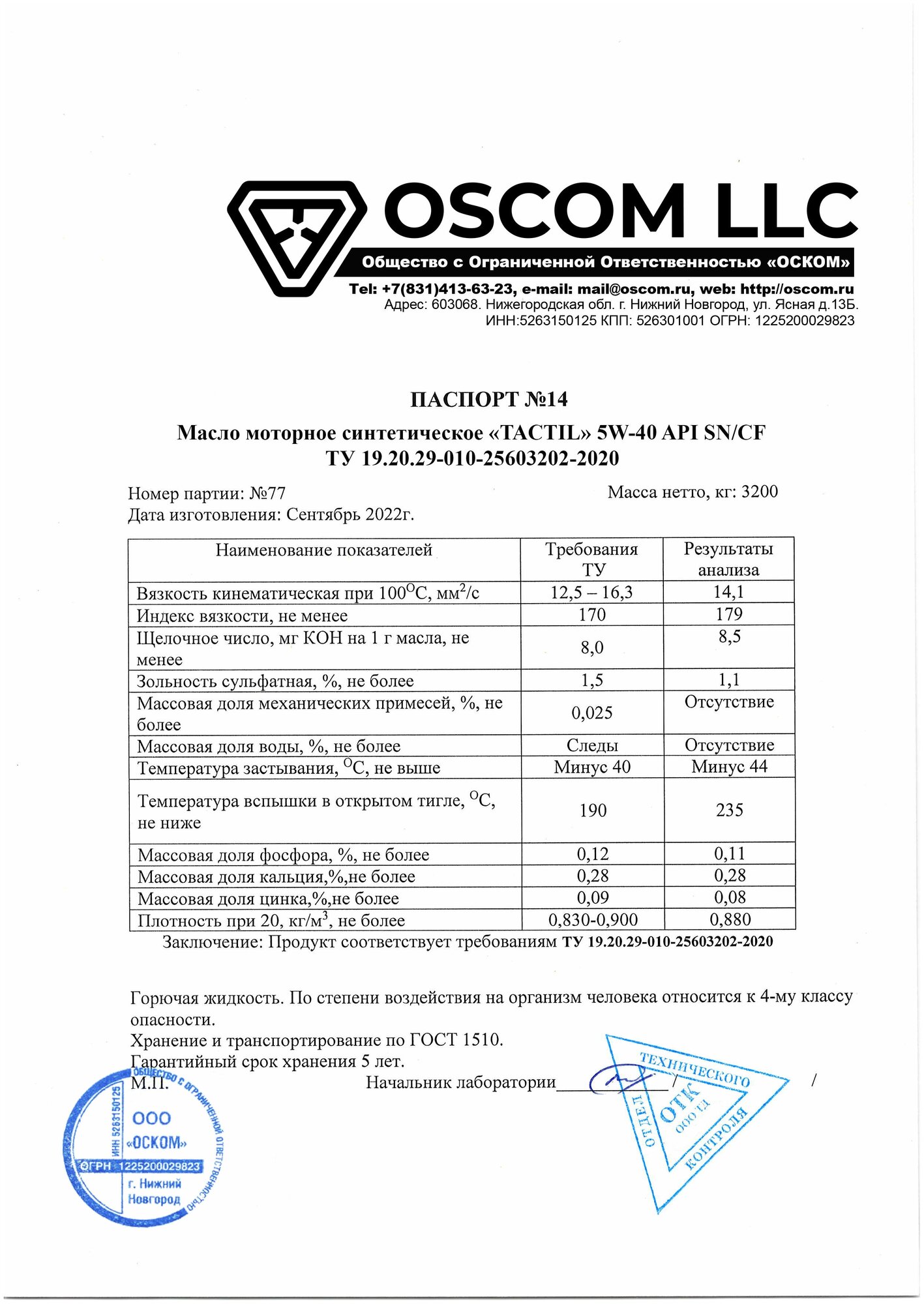 SAE viscosity grade: 5W-40, oil type: synthetic, fuel type: gasoline, diesel, methane, API standard: CF, SN, ACEA standard: A3/B4, engine type: four-stroke, for turbocharged engines