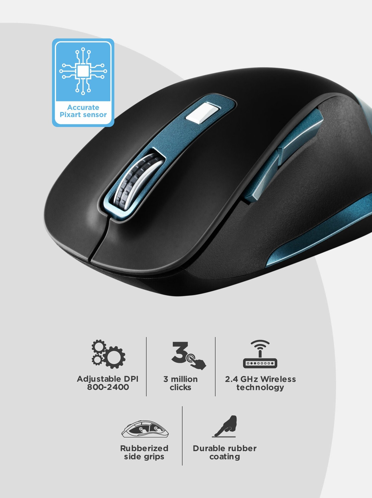 Connection interface: USB Type A, radio channel, design: right-handed, operating principle: optical LED, number of keys: 6, optical sensor resolution: 2400 dpi