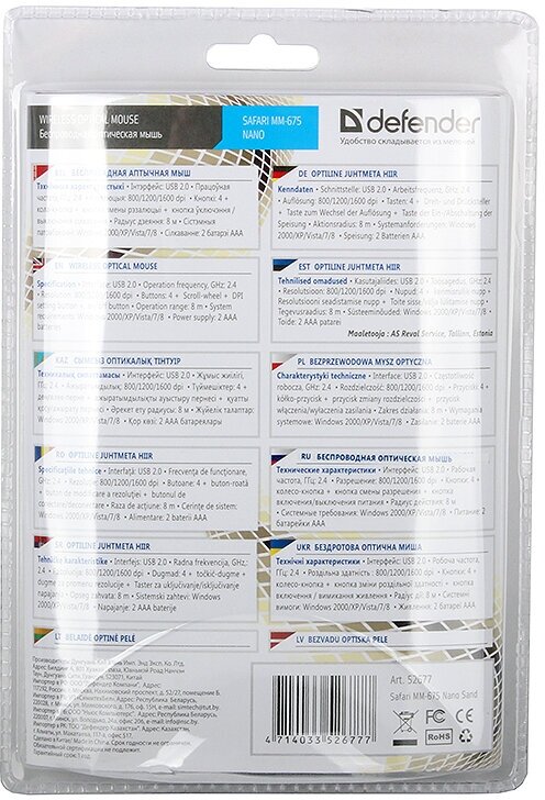 Mouse sensor resolution, DPI: 800 / 1200 / 1600; number of clicks: 5 million; PC system requirements: Windows 2000/XP/Vista/7/8/10, Mac OS X10