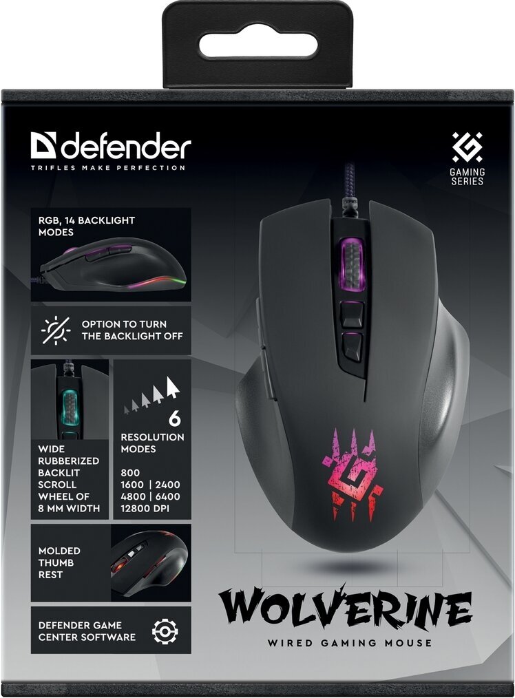 RGB backlight - 14 modes; mouse sensor resolution, DPI 800 / 1600 / 2400 / 4800 / 6400 / 12800; ferrite interference filter; wide rubberized scroll wheel 8 mm wide with backlight; frame rate 7000