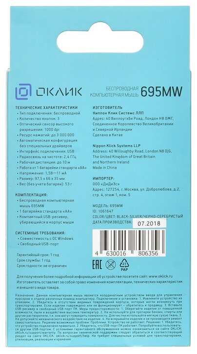 Connection interface: USB Type A, radio channel, design: right-handed, operating principle: optical LED, number of keys: 3, optical sensor resolution: 1000 dpi