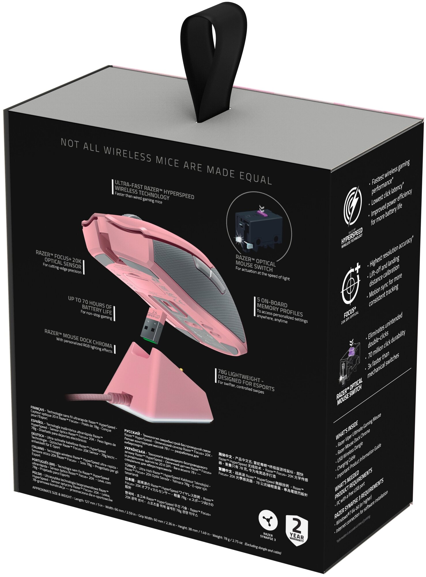 Razer Viper Ultimate gaming mouse, Razer charging dock; Wireless USB transmitter 2.4 GHz stored inside the mouse, adapter for wireless USB transmitter, charging cable, instruction manual