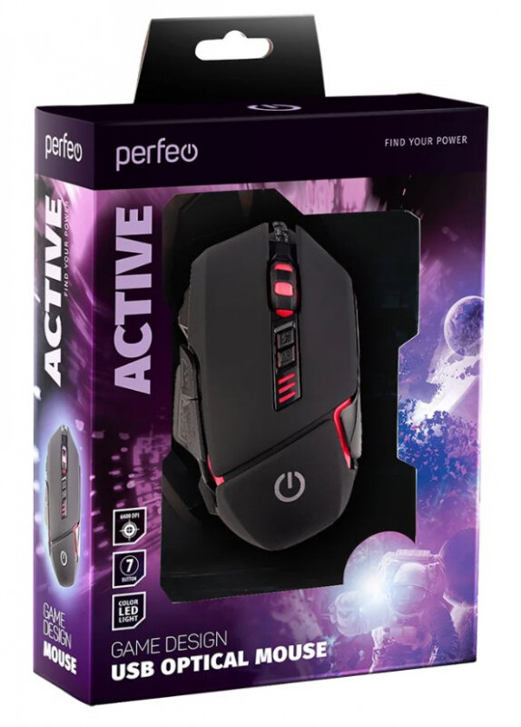 Game wired Perfeo ACTIVE, 7 kn, USB, black, 4 col. backlight, 1000-6400 DPI PF_B4889