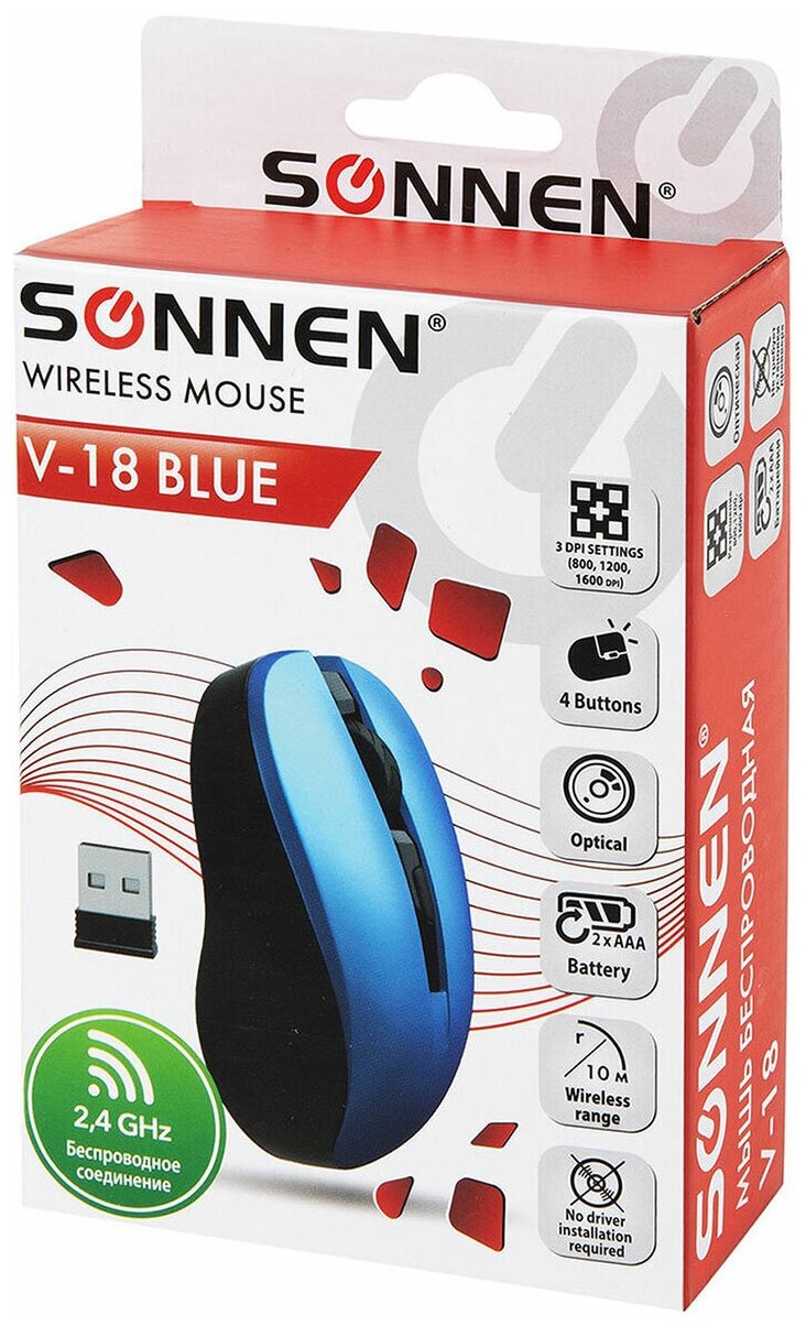 Wireless with silent click SONNEN V18, USB, 800/1200/1600 dpi, 4 buttons, blue, 513515, 513515