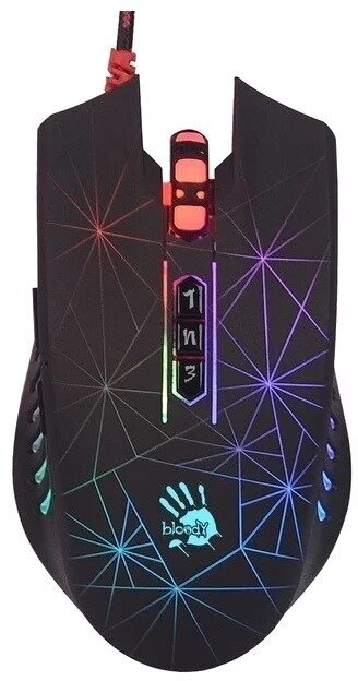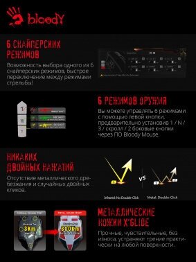 Response time: up to 0.2 ms; backlight can be adjusted using Bloody 6 software; scroll wheel: more than 1 million revolutions; metal legs X' Glide: over 300 km; microswitches: more than 20 million right/left button presses; change in feeling