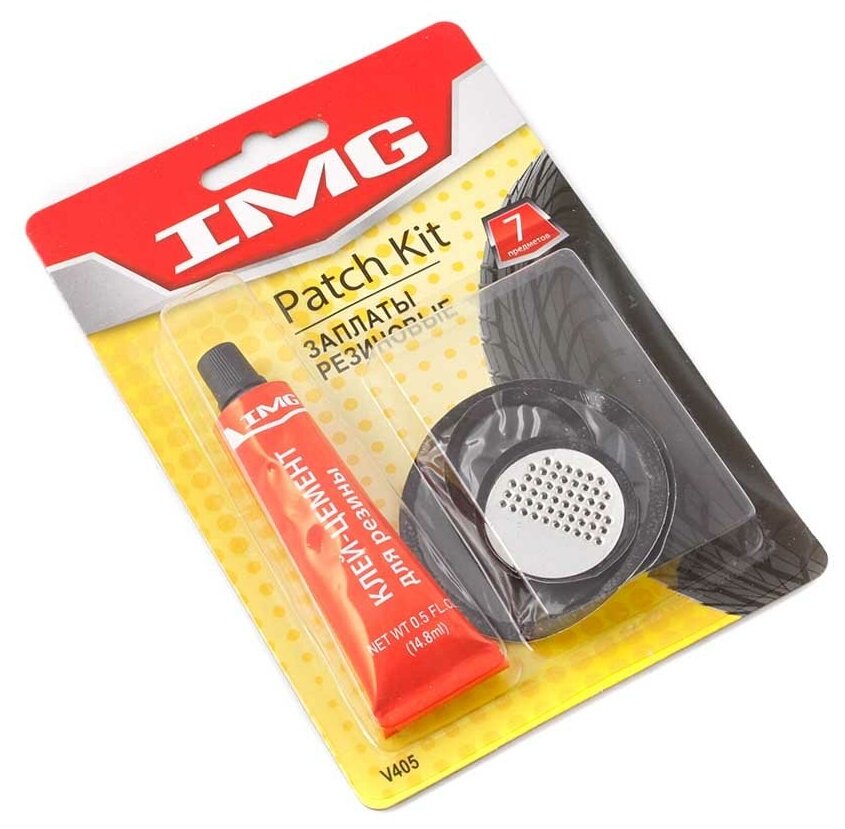 Glue-cement for rubber – 11 ml, round rubber patches: 3.2 cm in diameter – 3 pcs, 5.7 cm in diameter – 2 pcs, metal grater – 1 pc.