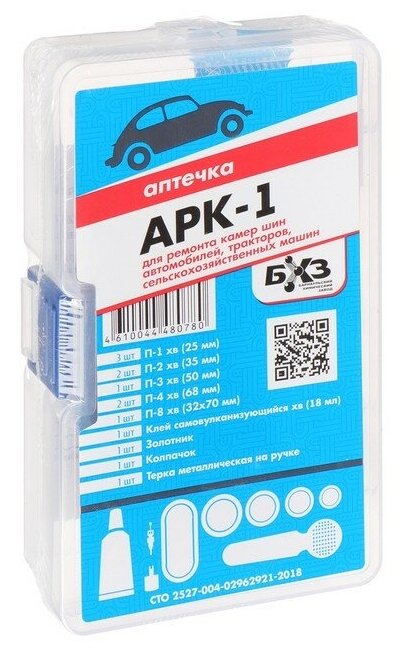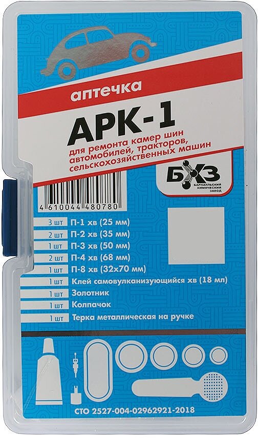 Rubber plaster P-1 d=25 mm - 3 pcs., Rubber plaster P-2 d=35 mm - 2 pcs., Rubber plaster P-4 d=50 mm - 1 pc., Rubber plaster P-5 d=68 mm -1 pc., Rubber plaster P-8 32x70 mm -1 pc., Rubber plaster P-9 40x100 mm -1 pc., Plaster