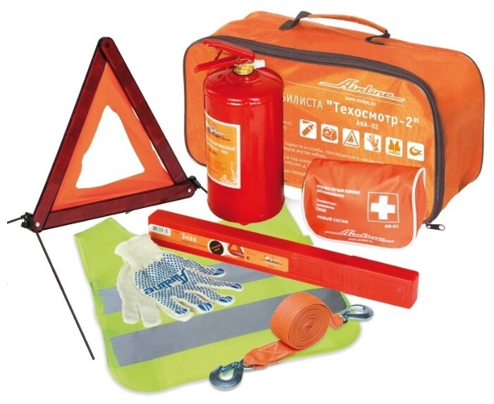 First aid kit, reflective vest, warning triangle, fire extinguisher, gloves, tow rope
