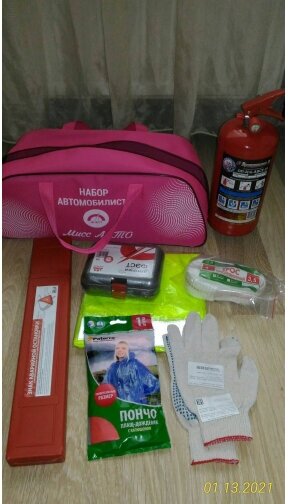 Set includes: first aid kit, raincoat, warning triangle, fire extinguisher, gloves, tow rope, number of items: 6 pieces, storage bag, type of vehicle: passenger cars