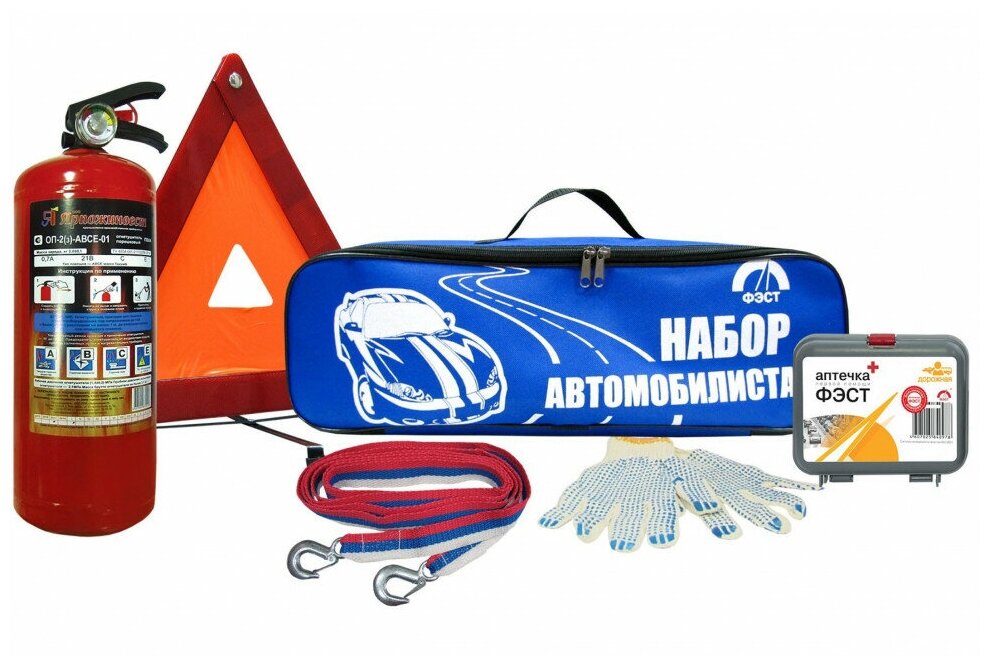 First aid kit for the road "FEST" Metal fire extinguisher with pressure gauge OP-2Z Warning triangle Towing rope with hooks 3.5 t, 4 m PVC gloves Signal vest Case bag