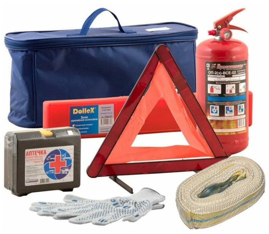 First aid kit, warning triangle, fire extinguisher, gloves, tow rope