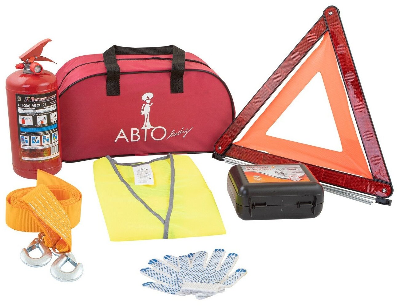 First aid kit, reflective vest, warning triangle, fire extinguisher, gloves, tow rope