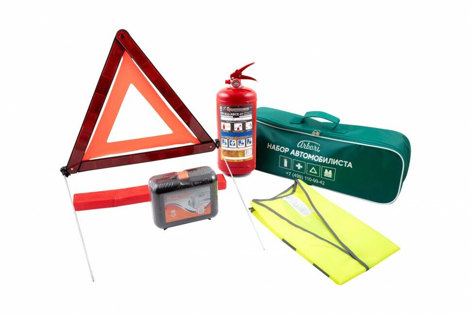 First aid kit, reflective vest, warning triangle, fire extinguisher
