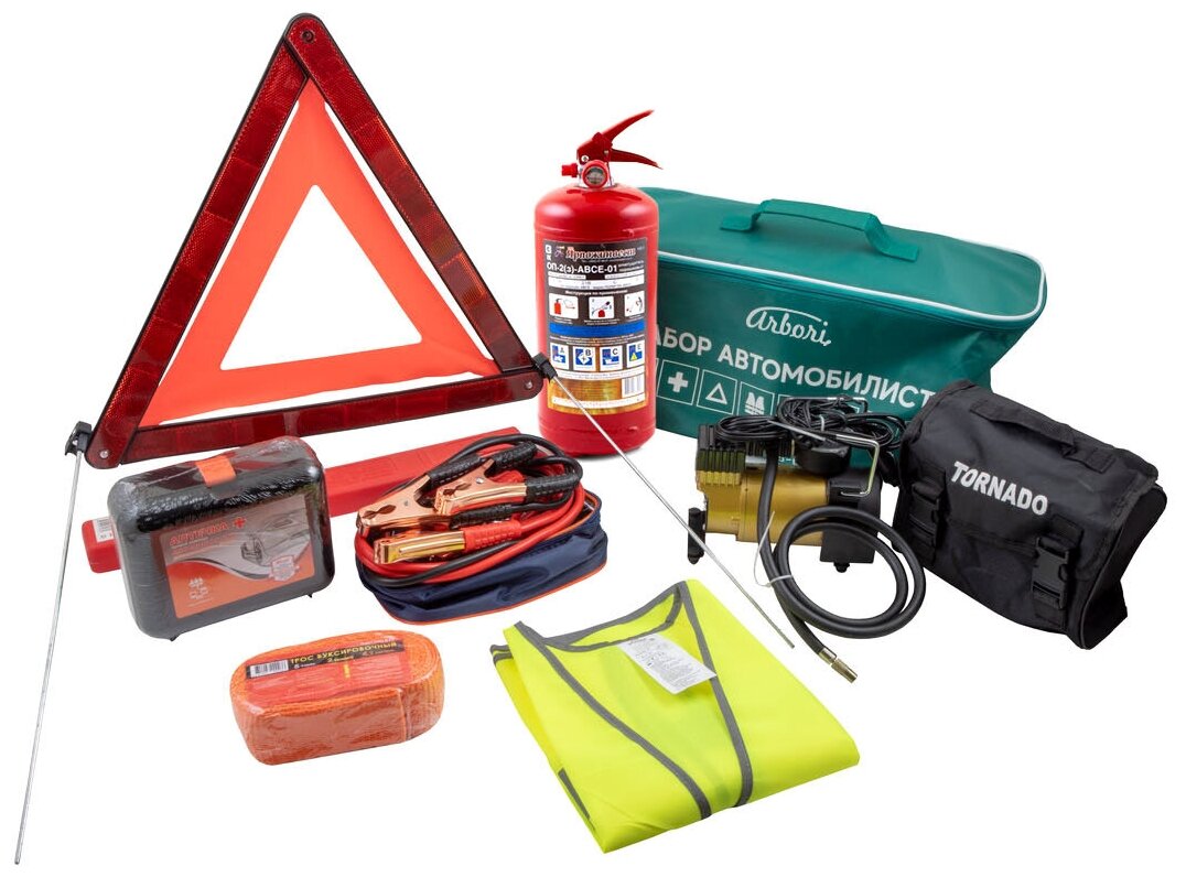 First aid kit, reflective vest, warning triangle, compressor, fire extinguisher, gloves, tow rope