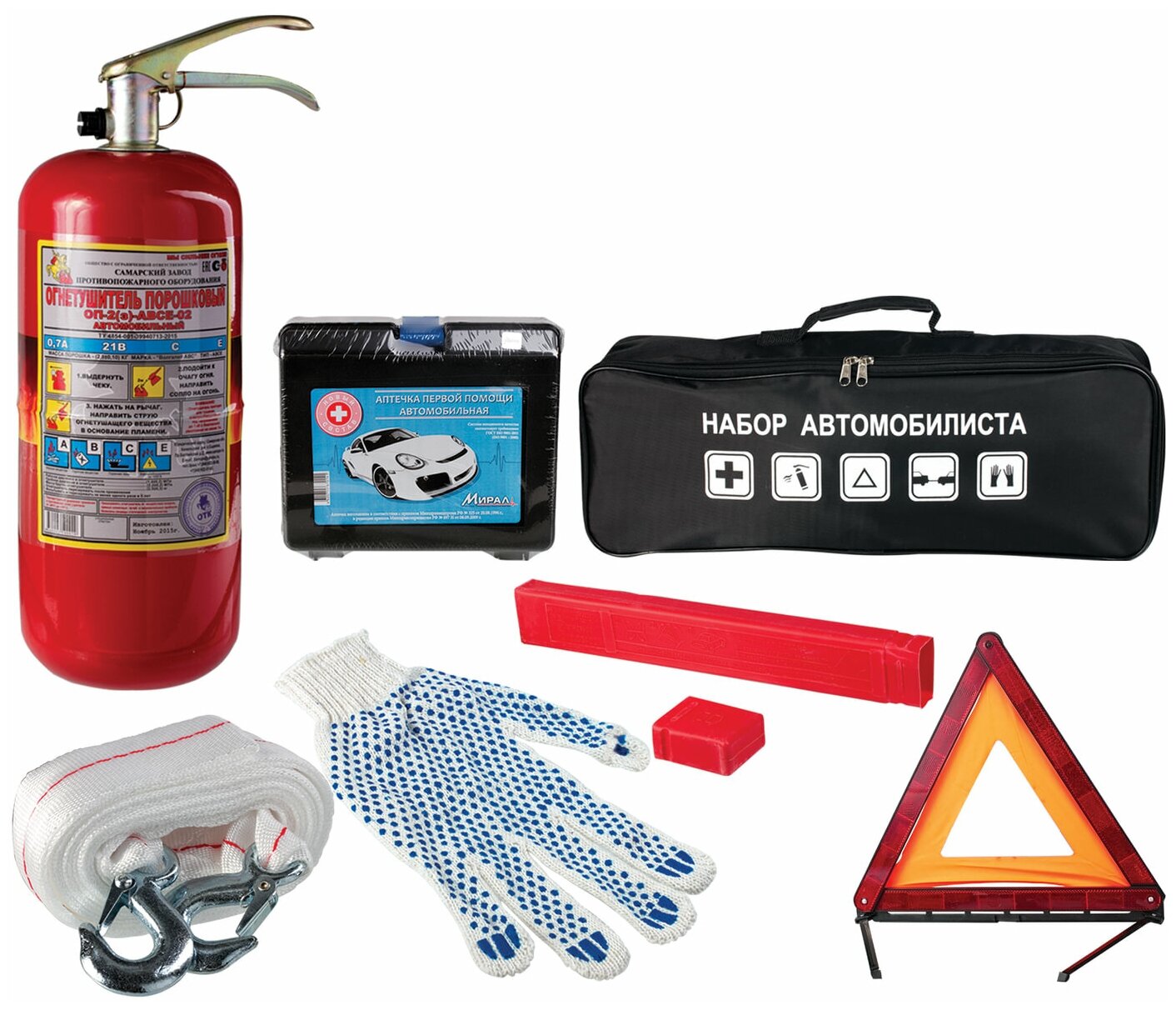 Set includes: first aid kit, warning triangle, fire extinguisher, gloves, tow rope