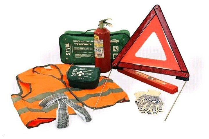 First aid kit, reflective vest, warning triangle, fire extinguisher, gloves, tow rope