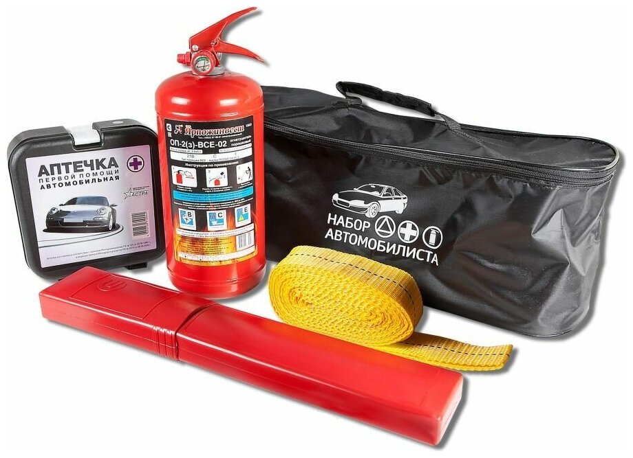 Set includes: first aid kit, warning triangle, fire extinguisher, towing rope, number of items: 4 w, storage bag, rope traction load: 5 t, type of vehicle: passenger cars