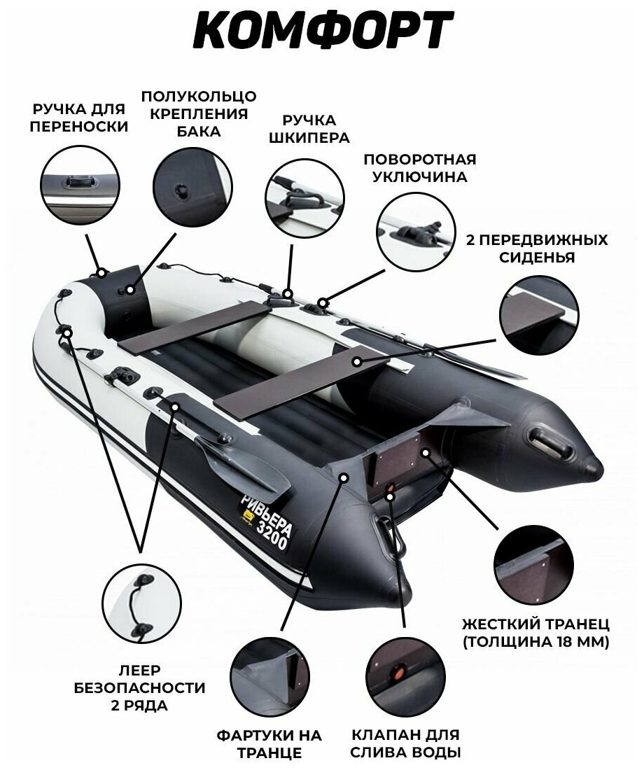 Fender; connection type: butt; balloon diameter: 42 cm; set weight: 33 kg; cockpit length: 220 cm; cockpit width: 63 cm; number of air compartments: 3; bottom material: reinforced PVC; seam type: vulcanization