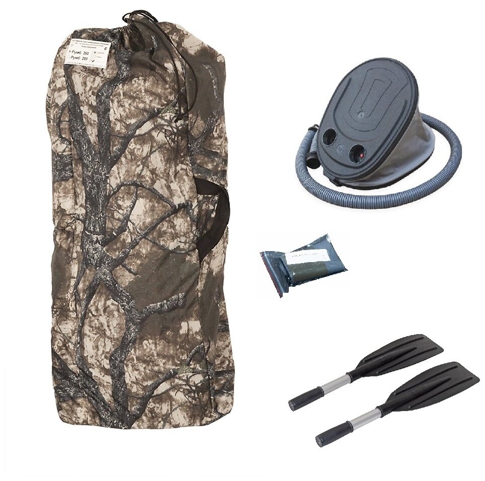 - boat;<br/> - pump;<br/> - rows 2 pcs.;<br/> - seat;<br/> - pouch bag;<br/> - cloth for repair;<br/> - product passport and warranty card.