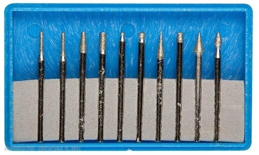Type: burr, purpose: grinding, processed materials: ceramics, metal, plastic, glass, set, number of items: 10 pcs., case