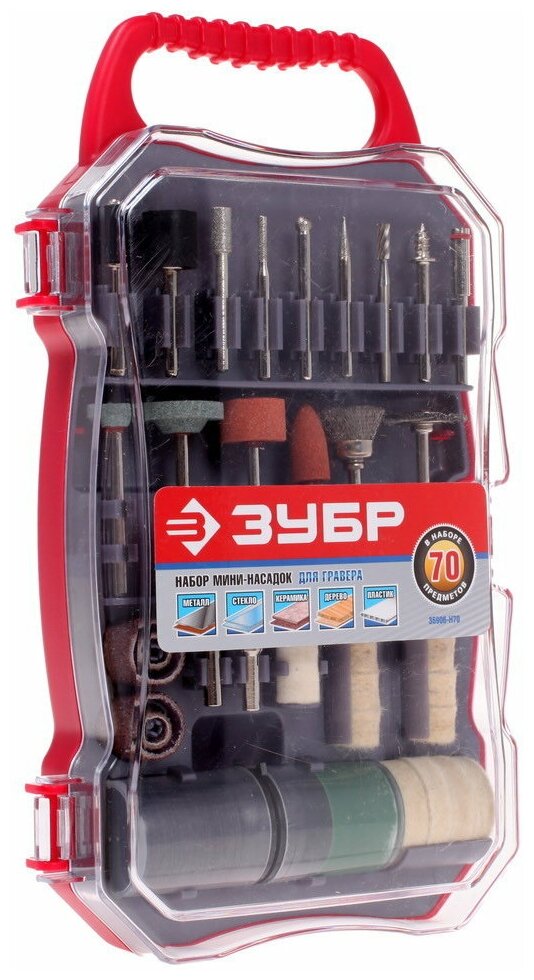 Type: burr, purpose: engraving, cleaning, polishing, cutting, grinding, processed materials: wood, stone, ceramics, metal, plastic, set, number of items: 70 pcs., case