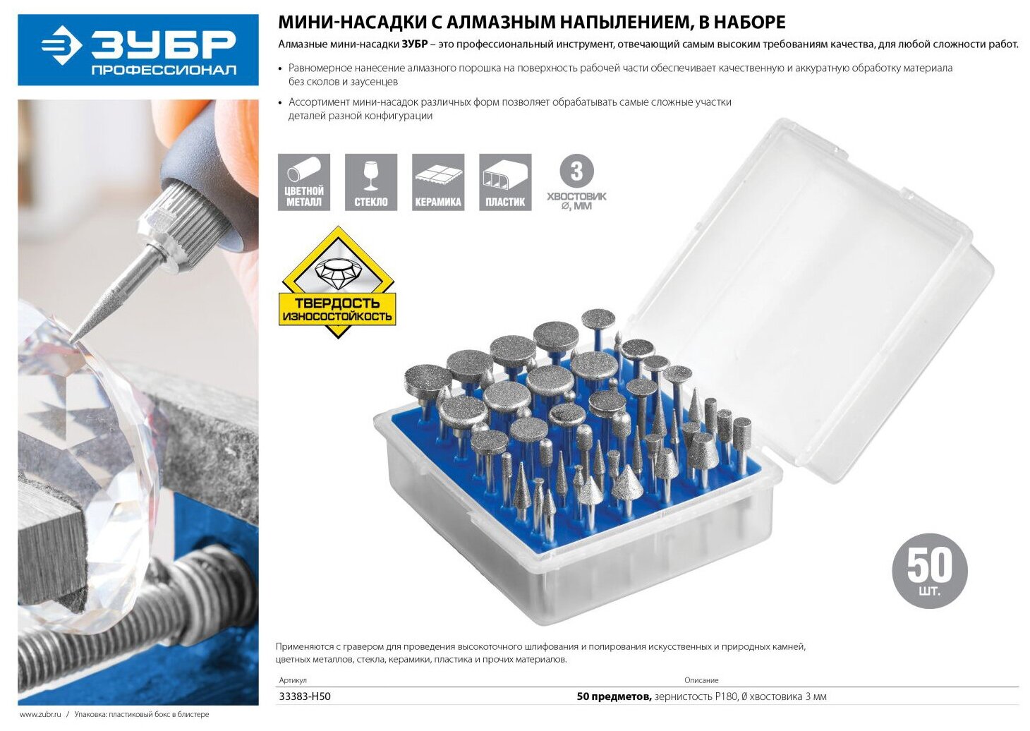 ZUBR P180, shank 3 mm, set of mini engraver bits, 50 pcs 33383- H50 Professional